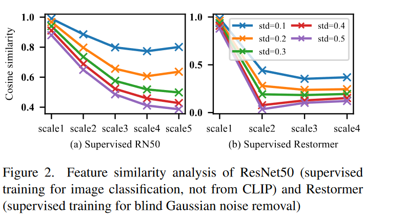 然后作者又测试了基础的监督学习 RN50 网络以及 Restormer,可以发现并不具有普适性,这种效果源自 CLIP。