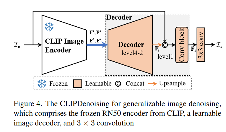 因为这种特性,所以作者选用 CLIP 的 RN50 Encoder 前四层作为去噪网络的第一部分,然后再通过一个可学习的 Decoder 以及 3$\times$3 的 Conv block 来还原干净图像。