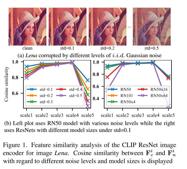 概括:作者发现 CLIP 里冻结的 ResNet 图像编码器,其前 4 层多尺度密集特征对噪声相对不敏感同时保持内容判别性。于是通过训练一个编码器,将带噪声的图像还原为干净图像。