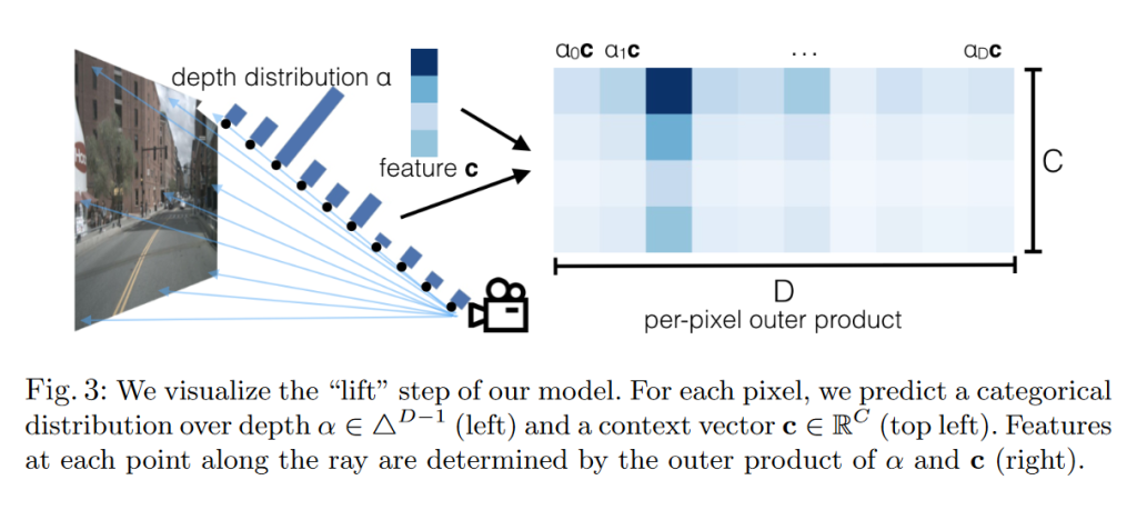 Lift:对每个图像进行单独处理,将每个图片从二维升维到三维坐标系。在单目目标检测中,一般需要先将深度转换为参考坐标系坐标,在 LSS 中则是直接为每个像素生成所有可能深度的表示。对每个像素的输出就是 $c \alpha_d$,即语义特征向量和深度概率的外积。